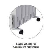 The Glen 7012 Electric Oil Filled Radiator Room Heater is ideally designed for long spell of heating. It comes with 9/11/13 thermal fins to maximize heat flow keeping a low surface temperature. It gives a warm sunlight feel and spreads warmth in the room evenly and silently. It has thermostat to maintain desired temperature and overheating protection. Having castor wheels and handle, it allows convenient movement across the room.