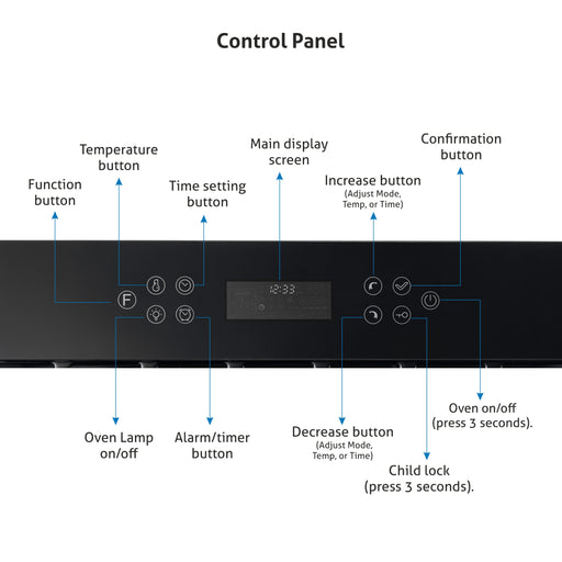 - 9 Functions Control – Lamp, Defrost, double grilling + fan, double grilling, Pizza function (Rapid heating or bottom heat element + fan), Convection + fan, - Lower heater + Upper heater, Bottom heat, Convection