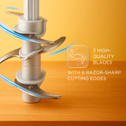 - 3 Rust resistant blades with 6 cutting edges and a whisking disk for liquids