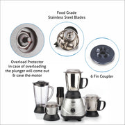 Mixer Grinder 750W 100% Copper Motor, 1 Transparent Jar, 3 Stainless Steel Jars, - Silver (4022 PLAT PLUS)