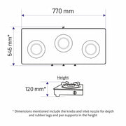 - Free Standing Hob equipped with 3 Different Forged Brass Burners: 1 high flame, 1 big and 1 small burner for diverse cooking requirements.