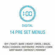 - 14 Pre-set menus (DIY, Toast, Bake, Roast, Broil, Bagel, Pizza, Cookies, Rotisserie, Potato, Corn, Keep Warm, Defrost, Ferment)